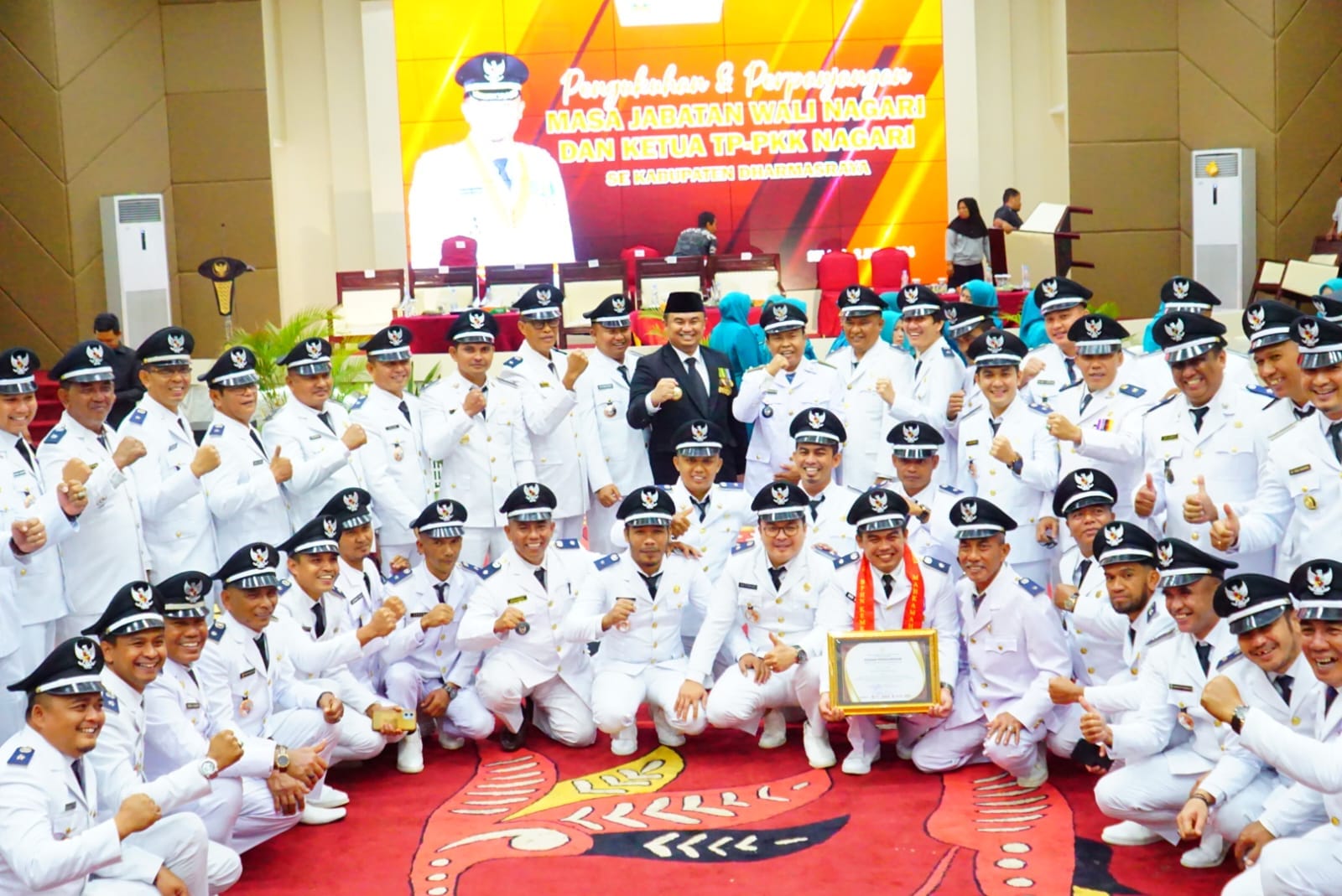 Bupati Dharmasraya, Sutan Riska Tuanku Kerajaan bersama dengan 52 wali nagari yang dikukuhkan masa jabatannya menjadi 8 tahun. [foto: Pemkab Dharmasraya]