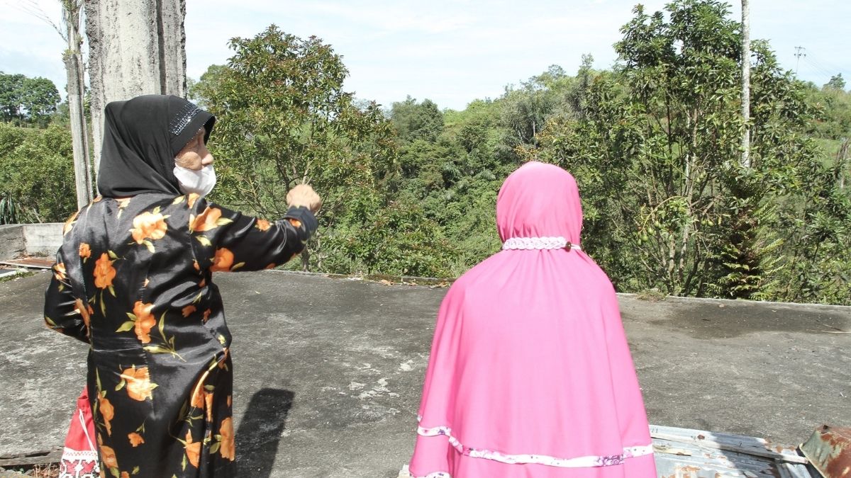 Langgam.id – Dua perempuan, Nadiani (80) dan Manismar (87), berdiri di atas pondasi rumah menggantung. Mereka menatap pegunungan Bukit Barisan sambil berdoa bagi mereka yang dikuburkan tanpa batu-batunisan. Ini mereka lakukan di pinggir Padang Hijau, Nagari Gadut, Kecamatan Tilatang Kamang, Kabupaten Agam, Sumatra Barat