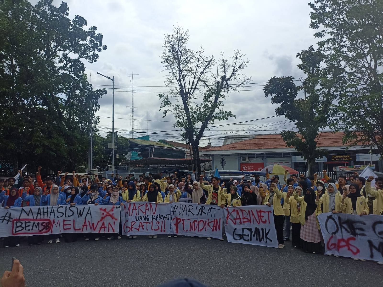 Beberapa spanduk bertuliskan “Makan Uang Rakyat Gratis”, “Oke Gas Oke Gas, Mana Gas?” dibentangkan saat menuju halaman kantor DPRD Sumbar.