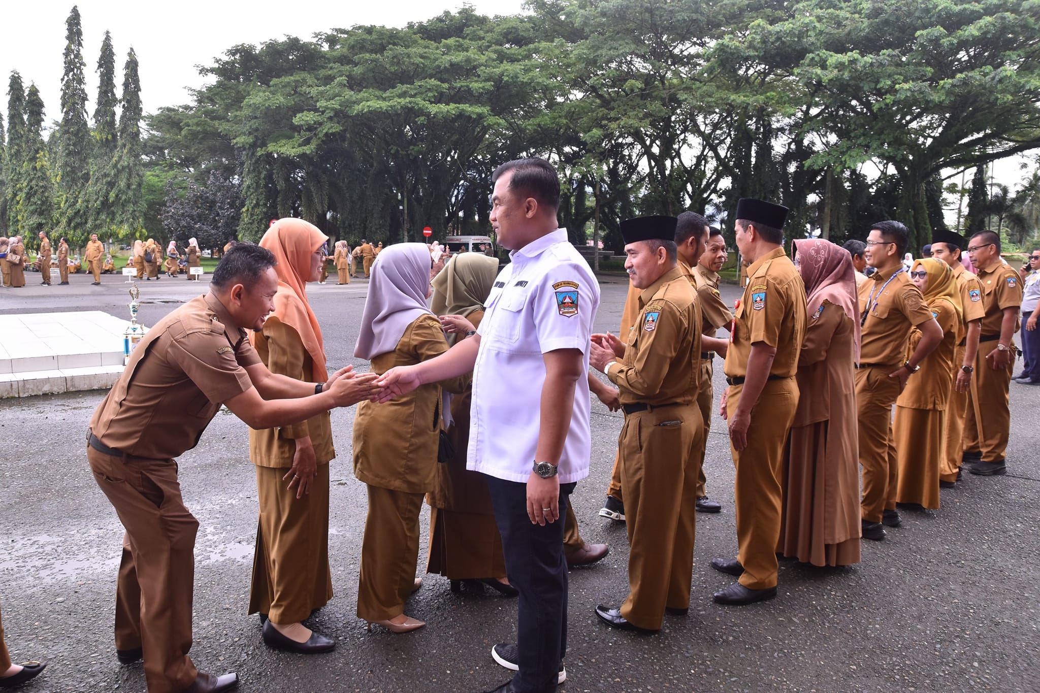 Kegiatan apel gabungan ditutup dengan saling bersalaman antara Bupati Sutan Riska dengan seluruh ASN Pemkab Dharmasraya sebagai wujud saling bermaaf-maafan dalam memasuki bulan Ramadan 1445 H/2024. (*/yki)