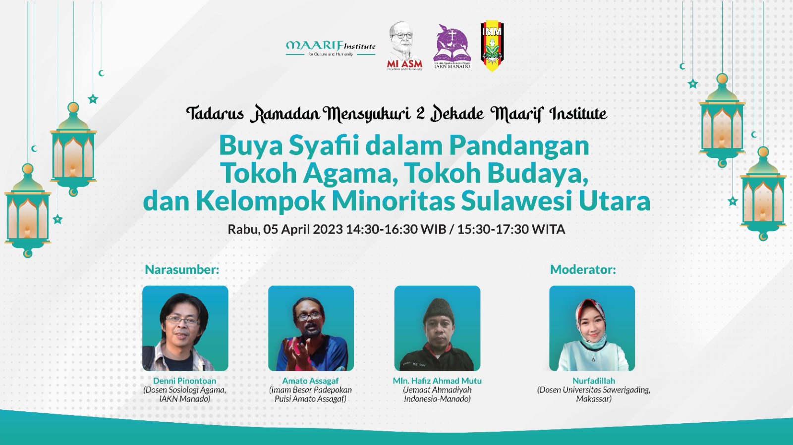MAARIF Institute bekerjasama dengan (Madrasah Intelektual Ahmad Syafii Maarih (MI-ASM), IAKN Manado dan IMM menggelar acara Tadarus Ramadhan melalui aplikasi zoom, bertajuk, ‘Mensyukuri Dua Dekade MAARIF Institute’, dengan tema, “Buya Syafii dalam Pandangan Tokoh Agama, Tokoh Budaya, dan Kelompok Minoritas Sulawesi Utara”.