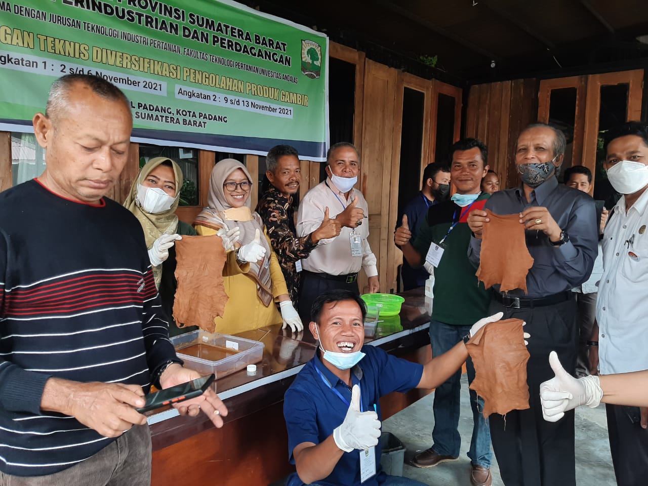 Untuk pelaksanaan Bimtek tersebut maka Disperindag Sumbar bekerja sama dengan Program Studi Teknologi Industri Pertanian Universitas Andalas sebagai instruktur baik untuk penyampaian materi Bimtek maupun untuk praktek pengolahan gambir menjadi berbagai produk.