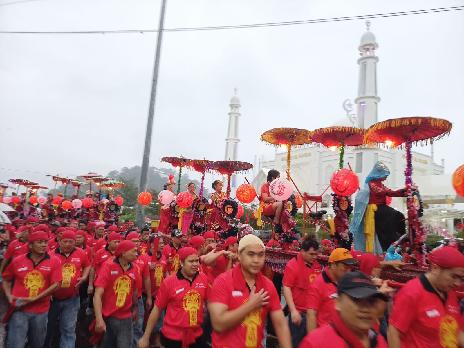 Arakan Kio dan Arakan Sipasan, parade puncak Festival Cap Go Meh di Padang, melahap jalanan sepanjang 3,8 Km, rutenya termasuk melewati simpang Muara Lasak - Nipah, depan Masjid Al Hakim. Ribuan orang dari berbagai kalangan dan etnis menyaksikan parade dengan semangat multikultural ini. Foto: Yose Hendra