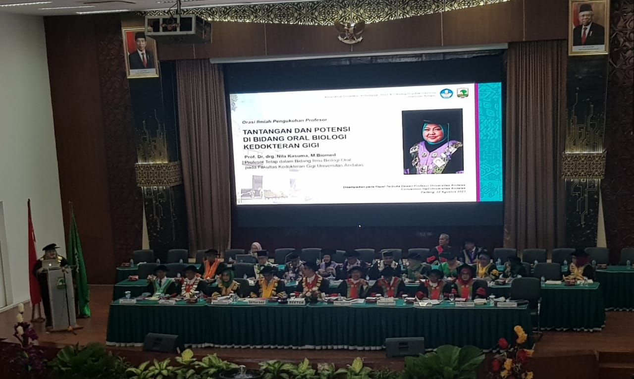 Langgam.id – Prof. Dr. drg. Nila Kasuma, M.Biomed resmi dikukuhkan sebagai guru besar tetap bidang ilmu Biologi Oral pada Fakultas Kedokteran Gigi (FKG) Universitas Andalas. Ia dikukuhkan bersama empat guru besar lainnya dari Fakuktas Hukum pada Selasa (22/8/2023) di Convention Hall Unand.