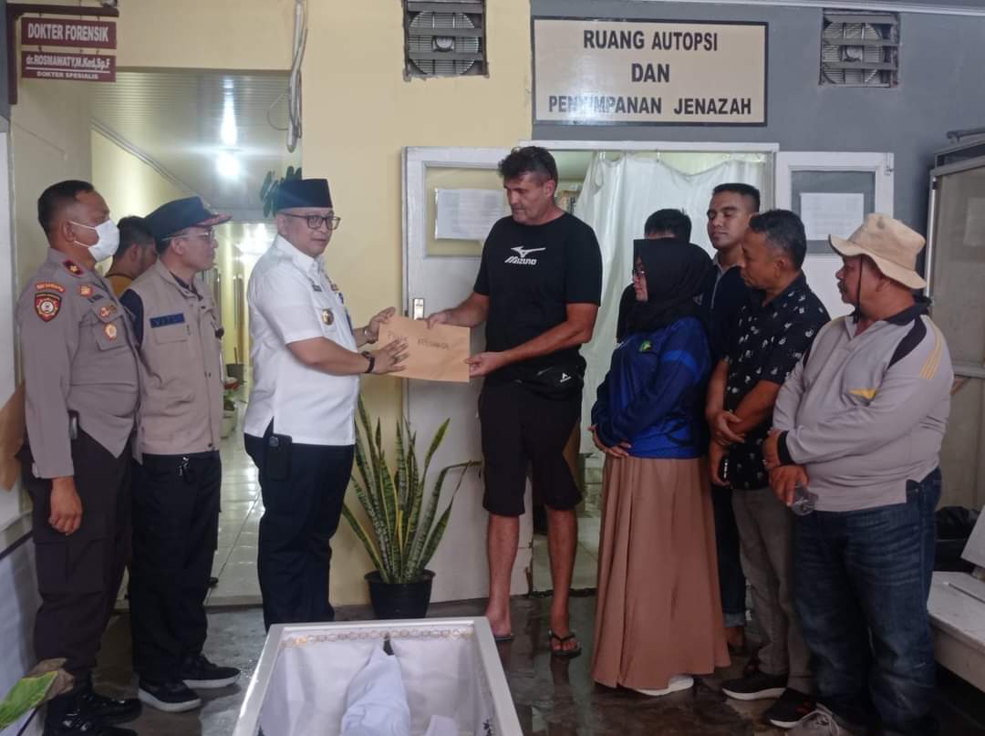 Jenazah Thuleau Florian Jean Justin dilepas di RS Bhayangkara Padang. Saat melepas jenazah, Pj Wali Kota Padang Andree Algamar menyerahkan sertifikat kematian kepada perwakilan keluarga korban. (*/Fs)