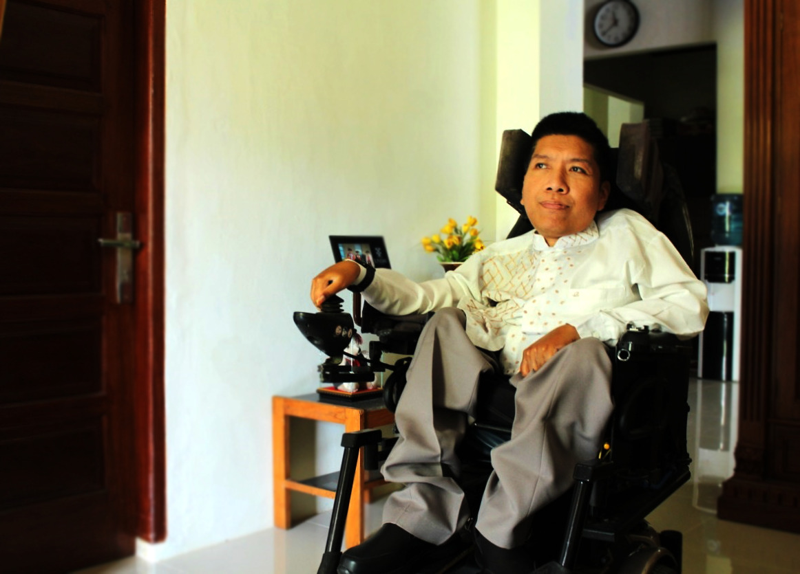 “Degenerasi fungsi otot secara bertahap. Sekarang hanya bisa menggerakkan kepala dan jari yang terbatas. Dulu masih bisa nulis. Kini sama sekali tidak. Waktu kuliah doktor, saya mengandalkan aplikasi digital untuk mencatat,”katanya membentang kisah hidup.