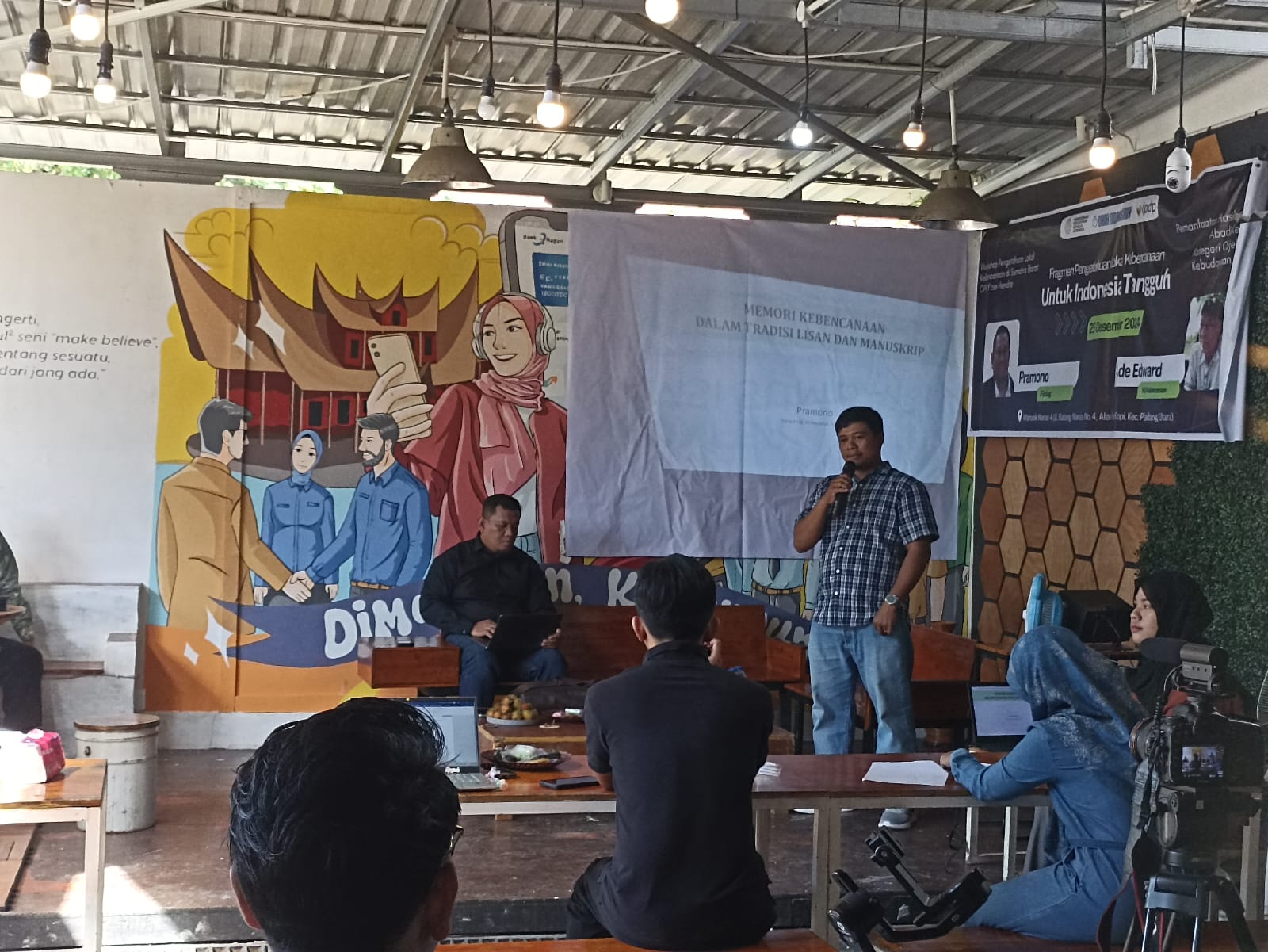 Sementara itu, Filolog dari Universitas Andalas Pramono memaparkan Sumatra Barat sesungguhnya punya tradisi lisan soal kebencanaan, seperti cerita asal-usul nama tempat (toponimi), misalnya Bungo Pasang, Tarandam, Ampang Gadang, Kubang Putiah, Batuhampa, dll.