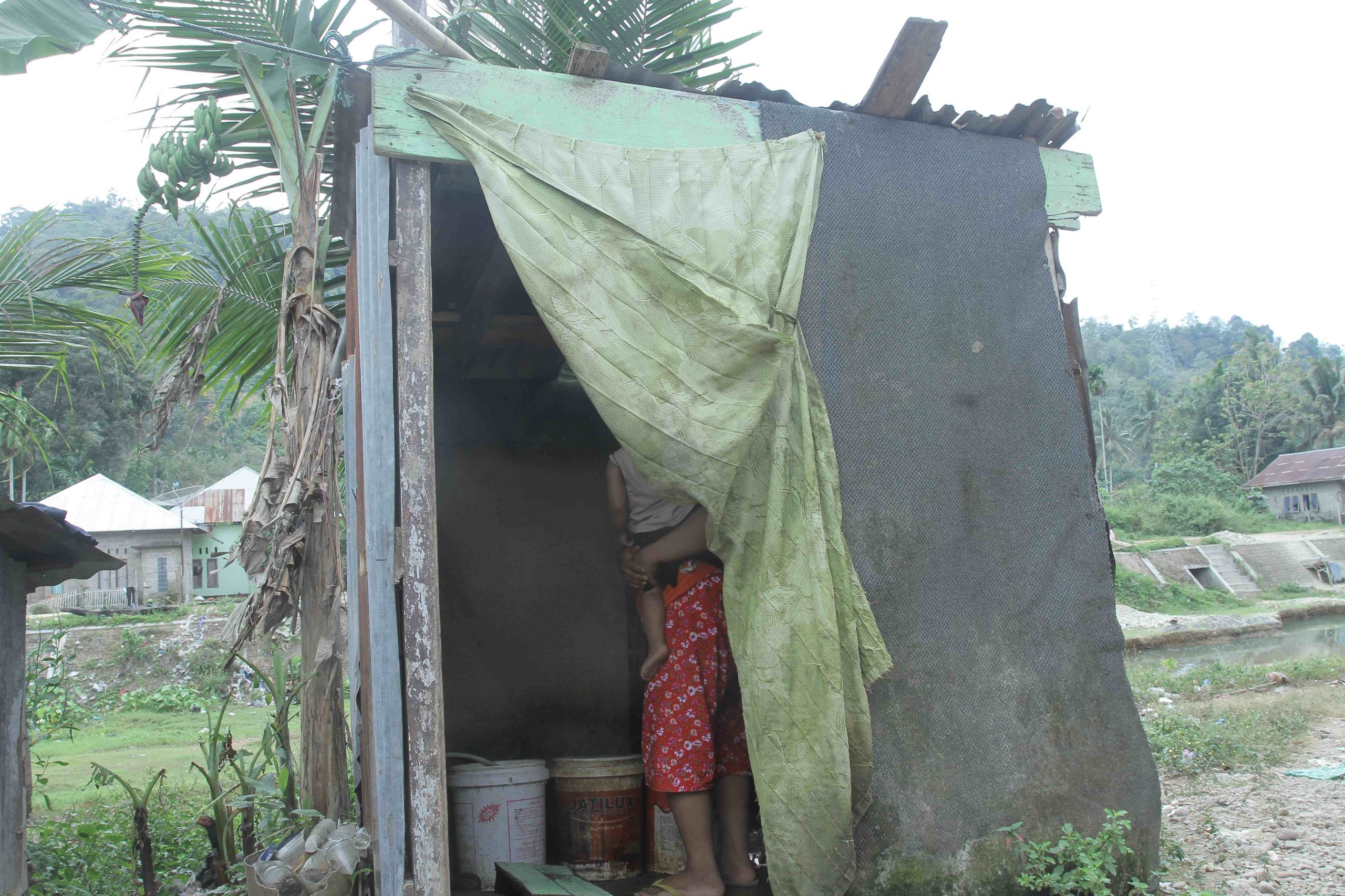 Kondisi kehidupan keluarga tersebut tanpa akses jamban yang layak, menjadikannya salah satu keluarga penerima bantuan akses jamban. Tak begitu jauh dari WC darurat, berdiri bangunan kecil untuk akses jamban.
