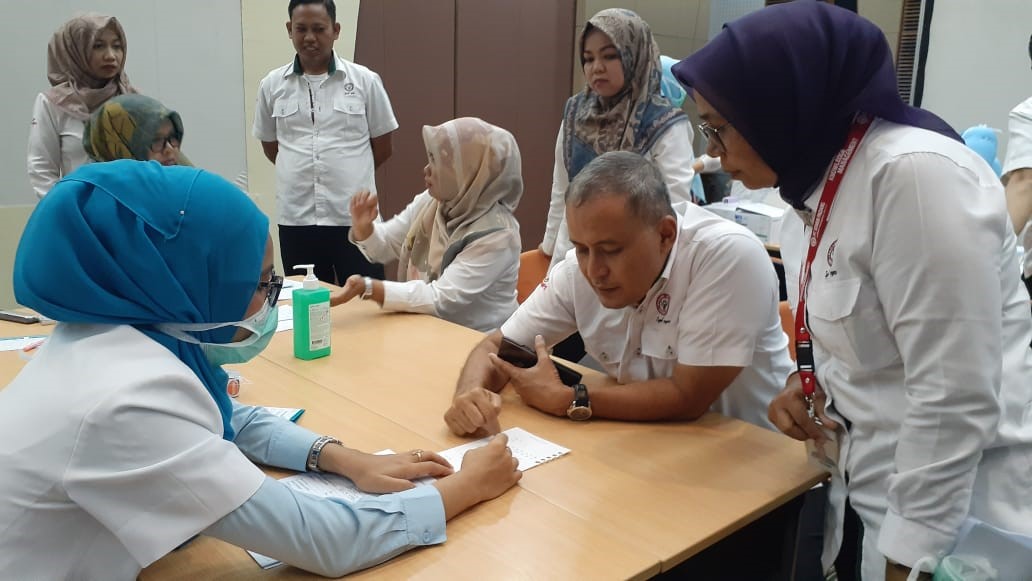Kepala Departemen Komunikasi & Hukum Perusahaan PT Semen Padang Oktoweri mendengar penjelasan dokter pada kegiatan vaksinasi influenza bagi karyawan/wati di Lantai I Kantor Pusat Semen Padang, Senin (16/3/2020). (Foto: Humas Semen Padang)