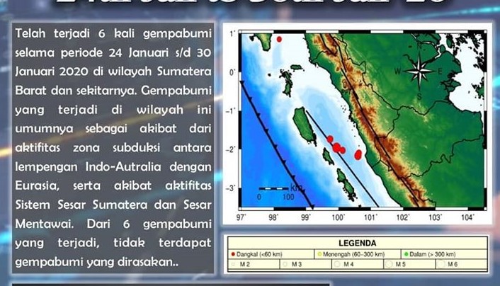 Demikian dilansir Badan Meteorologi Klimatologi dan Geofisika (BMKG) Padang Panjang dalam laporan mingguan aktivitas “seismicity” pada Selasa (4/2/2020) di akun resminya.