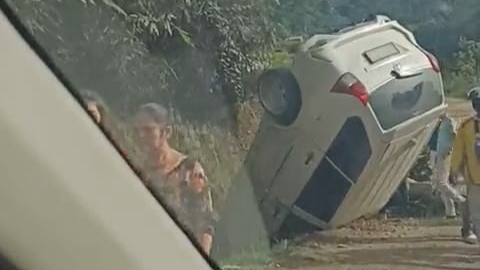 Dari video yang diterima,tampak minibus berwarna putih itu terbalik masuk got. Sejumlah pengendara lainnya berhenti untuk melihat kondisi mobil. (Irwanda/ABW)