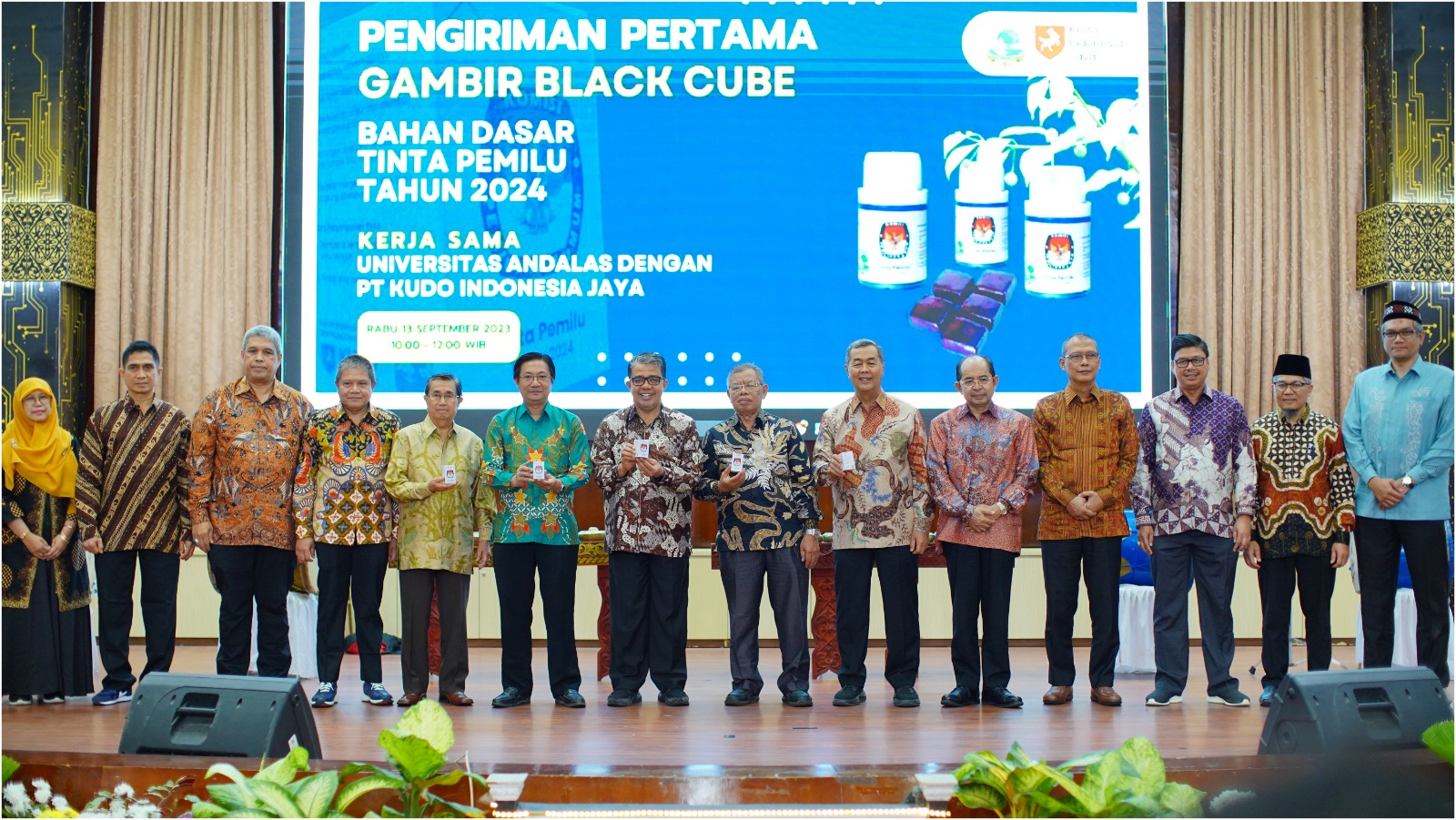 Pengiriman pertama bahan baku gambir untuk tinta pemilu 2024 secara simbolis dalam peringatan Dies Natalis ke 67 Unand. (Foto: Dok. Humas)