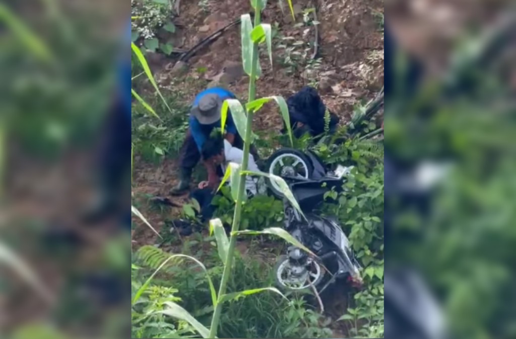 Berdasarkan video yang beredar, terlihat dua orang pria ditolong warga usai motor yang dikendarai terjun ke jurang. Diketahui juga bahwa motor tersebut mengalami rem blong sehingga sulit dikendalikan.