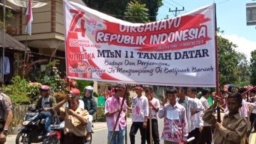 PalantaLanggam – MTsN 11 Tanah Datar atau yang lebih dikenal MTsN Subang Anak berhasil meraih peringkat 1 dalam lomba Pawai Alegoris tingkat Kecamatan Batipuh yang digelar, sabtu (17/8). Lomba tersebut sejatinya digelar dalam rangka memperingati HUT RI ke 74.
