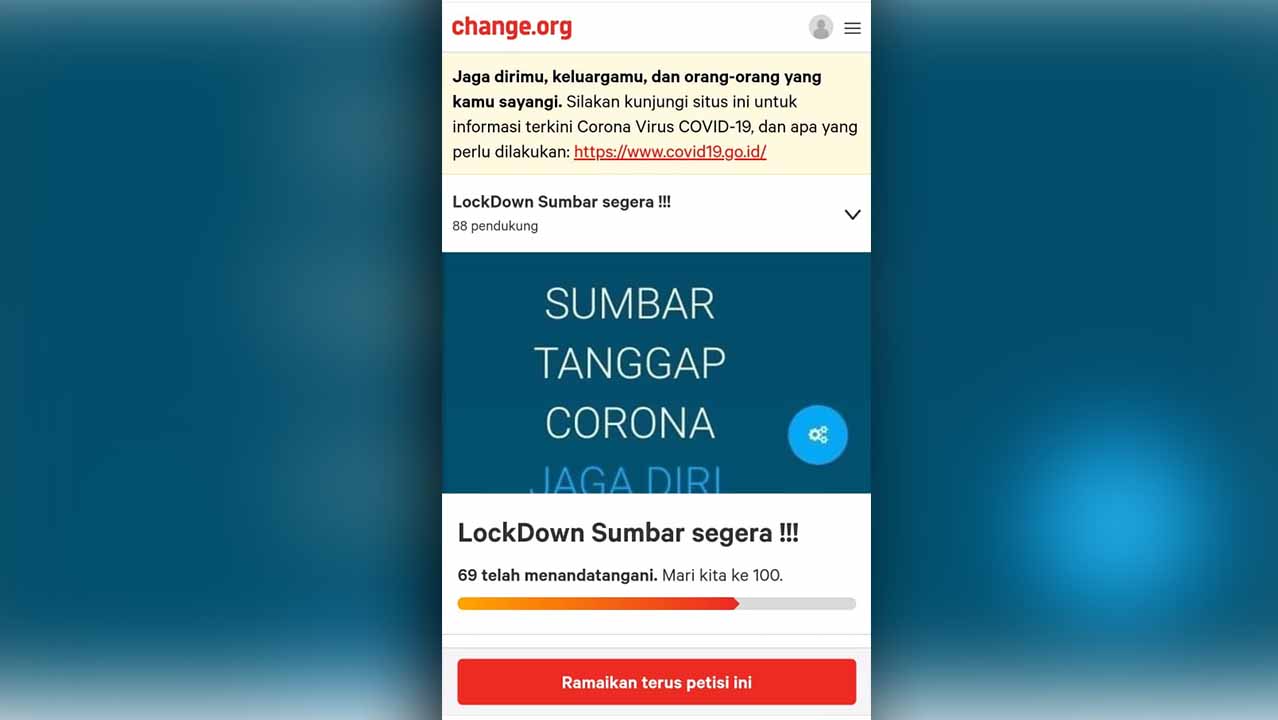 Petisi yang dibuat akun Kawal Covid-19 Sumbar di laman Change.org ini, diinisiasi pengacara Yul Akhyari Sastra dan akademisi Sari Lenggogeni. Mereka khawatir dengan penyeraban virus corona di Sumbar.