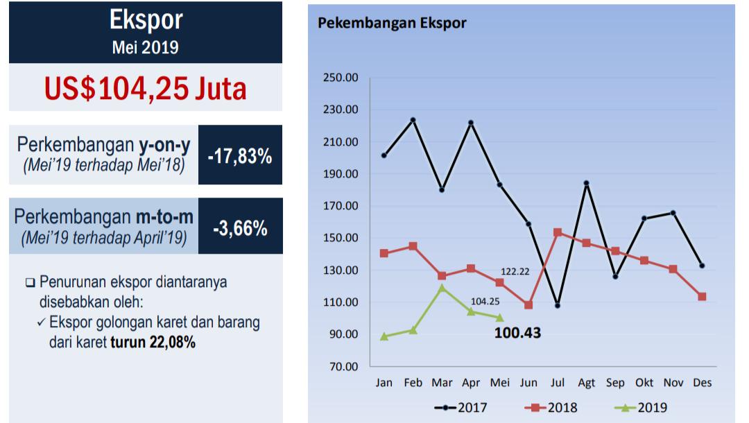 Kepala BPS Sumbar, Sukardi mengatakan secara kumulatif ekspor Sumatera Barat Januari hingga Mei 2019 mencapai 505,00 juta dolar. Nilai ini turun sebesar 24,04 persen dibandingkan periode yang sama pada tahun sebelumnya.