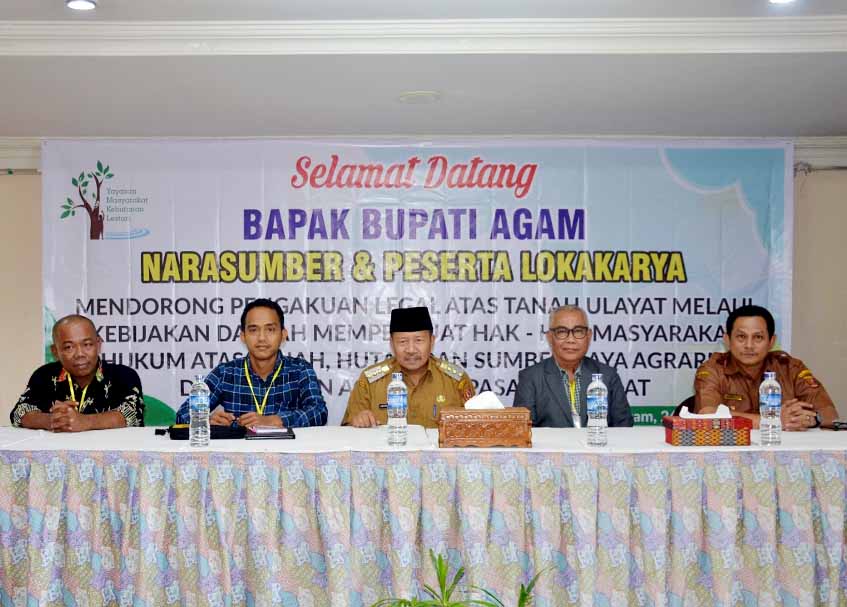 Hal itu disampaikan Bupati Kabupaten Agam, Andri Warman saat menjadi narasumber Lokakarya dalam rangka mendorong pengakuan legal atas tanah ulayat melalui kebijakan daerah, untuk memperkuat hak-hak masyarakat hukum atas tanah, hutan, dan sumber daya agraria di Kabupaten Agam dan Pasaman Barat, yang digelar di Hotel Nuansa Maninjau.