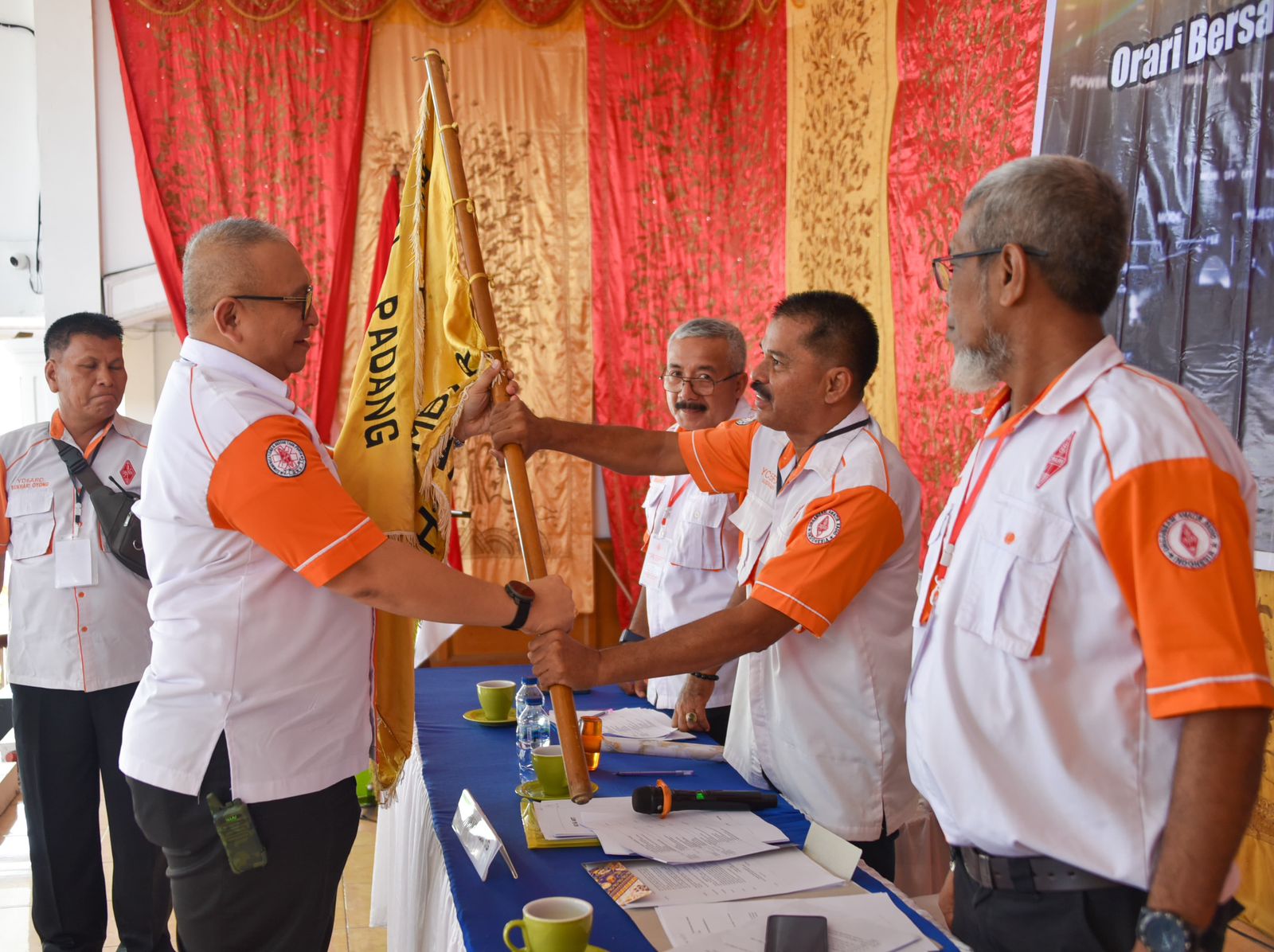 Dalam kesempatan ini Demisioner Ketua ORARI Kota Padang Andree Algamar menyerahkan bendera pataka kepada Pimpinan Sidang Musyawarah ORARI Padang Guswandi, sebagai tanda diterimanya laporan Pertanggungjawaban Pengurus ORARI Lokal Padang periode 2021-2024. (*/Fs)