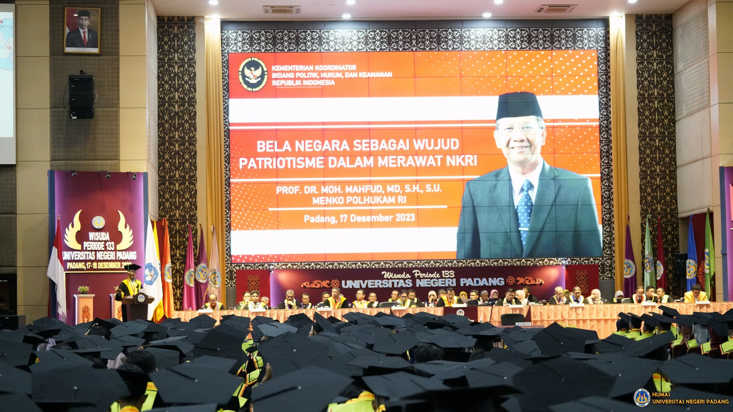 Langgam.id – Menteri Koordinator Bidang Politik, Hukum, dan Keamanan Republik Indonesia (Menko Polhukam) Prof. Dr. Mhd. Mahfud MD, S.H, S.U., M.I.P memberikan orasi ilmiah dalam wisuda di Universitas Negeri Padang, Minggu (17/12/2023) dengan tema ‘Menanamkan Nilai-nilai Patriotisme untuk Merawat NKRI’.
