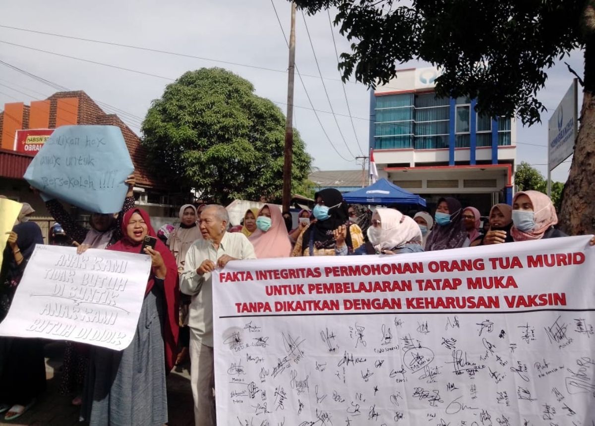 Dalam unjuk rasa itu, para orang tua tidak terima bahwa anak yang belum divaksinasi tidak bisa melakukan pembelajaran tatap muka (PTM).