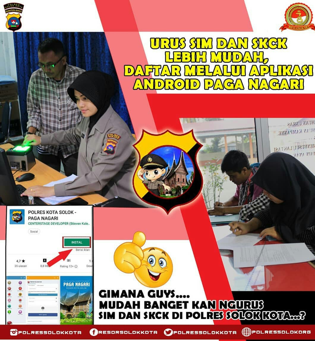Mendaftarnya pun mudah. Cukup mengisi formulir dan melampirkan persyaratan melalui aplikasi android “Paga Nagari”. Inovasi ini sudah berjalan sejak bulan November 2018. Total jumlah pemohon yang sudah mendaftar sebanyak 136 orang. Sedangkan pemohon SKCK mencapai 875 orang.
