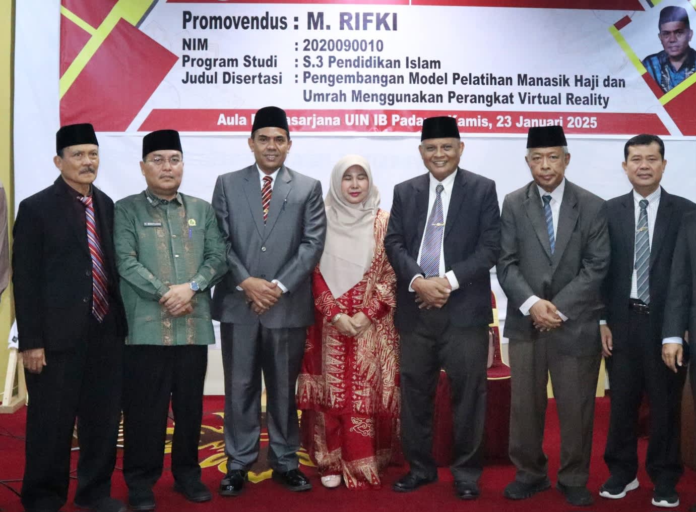 Rifki dinyatakan lulus dengan predikat sangat memuaskan dan berhak menyandang gelar Doktor Ilmu Pendidikan Islam setelah berhasil mempertahankan disertasinya yang berjudul “Pengembangan Model Pelatihan Manasik Haji dan Umrah Menggunakan Perangkat Virtual Reality.