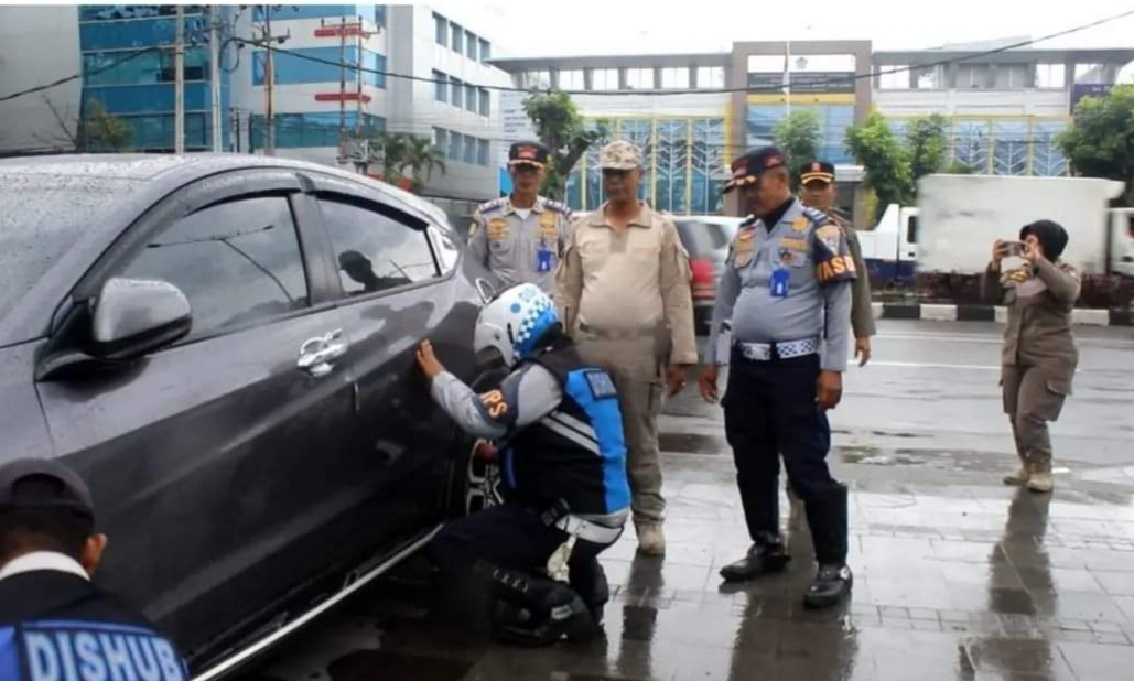 Tim gabungan menyisir kawasan di sepanjang Jalan Khatib Sulaiman Kota Padang, kendaraan yang kedapatan parkir sembarangan di kempeskan angin bannya.