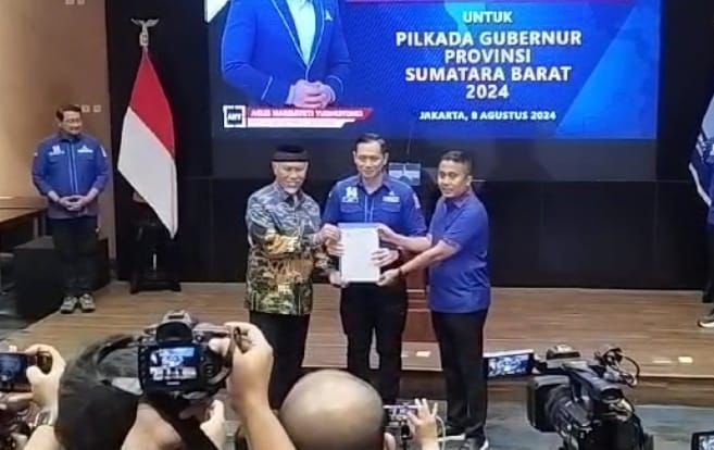 Surat rekomendasi dukungan ini diserahkan langsung oleh Ketua Umum Partai Demokrat, Agus Harimurti Yudhoyono (AHY), kepada pasangan Mahyeldi-Vasco di kantor DPP Demokrat, Jakarta, pada Kamis (8/8/2024).