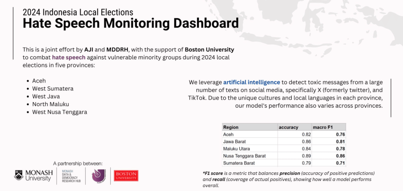 “Proyek pemantauan ini cukup rumit karena melibatkan kata kunci dalam berbagai bahasa daerah. Selain itu, setiap daerah juga memiliki konteks budaya mereka yang menjadi tantangan sehingga perlu kolaborasi dengan komunitas lokal, utamanya jurnalis lokal,” jelas Associate Professor Data Science Monash University Indonesia, Derry Wijaya, yang juga memimpin tim peneliti.