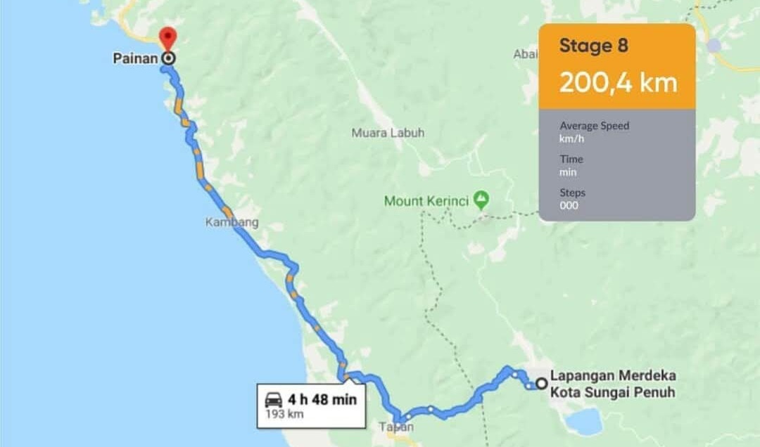 Etape delapan Tour de Singkarak 2019 yang akan start di depan Lapangan Merdeka, Kota Sungai Penuh, Jambi dan finish di alun Painan, Kabupaten Pesisir Selatan, Sumbar. Etape sejauh 200,4 kilometer tersebut melewati sejumlah daerah di Pesisir Selatan, seperti Indrapura, Kambang, Balai Selasa dan Batang Kapas.