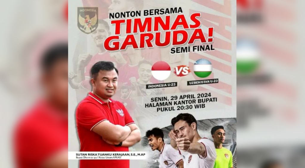 “Nonton bersama Timnas Garuda semifinal Indonesia U-23 vs Uzbekistan U-23, Senin, 29 April 2024 di Halaman Kantor Bupati pukul 20.30 WIB,” bunyi postingan tersebut.