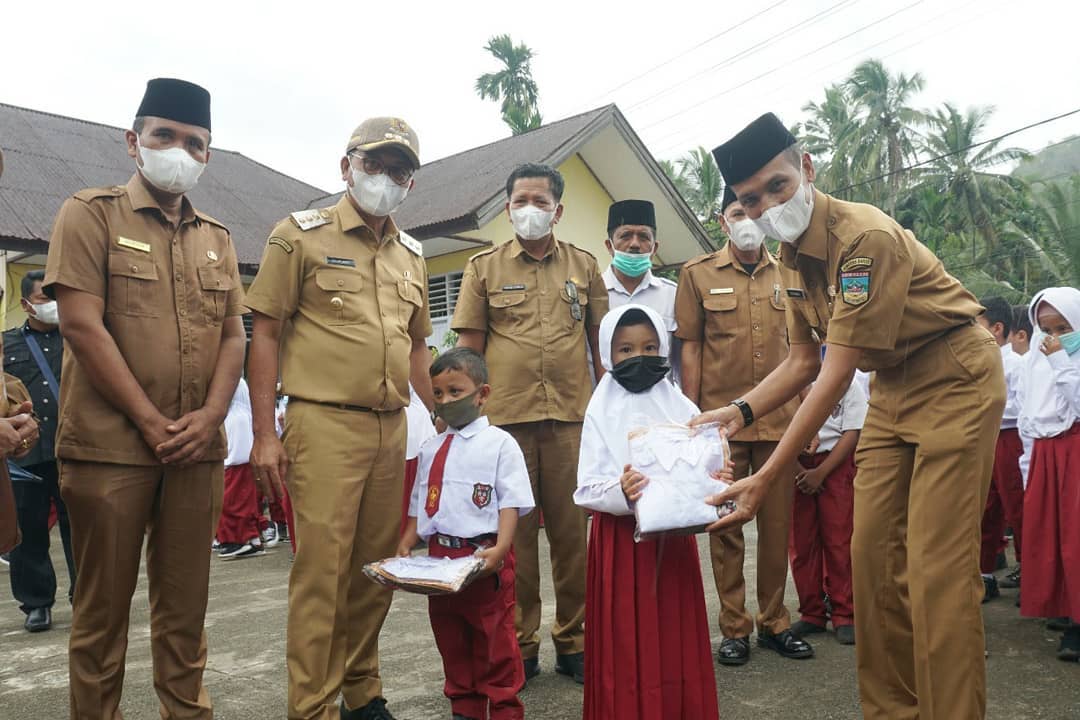 Untuk peluncuran perdana program seragam gratis ini, Bupati Solsel Khairunas dan Wabup Yulian Efi menyerahkan seragam gratis pada siswa di SMPN 3 Solsel, SDN 02 Pekan Selasa, dan SDN 04 Timbulun, Senin (12/7/2021.