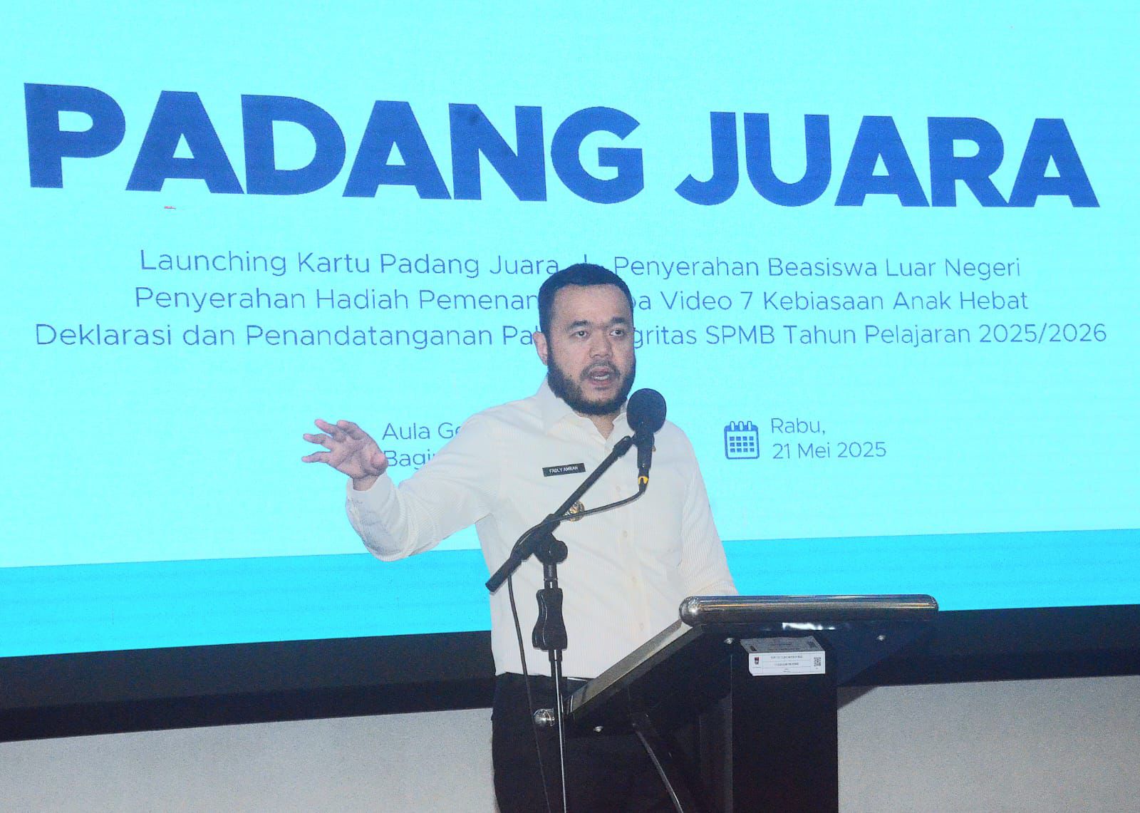 Progul “Padang Juara” yang menitikberatkan kepada bantuan dan beasiswa pendidikan bagi masyarakat Kota Padang, dilaunching secara resmi pada hari ini, Rabu (21/5/2025), Bagindo Azis Chan Youth Center.