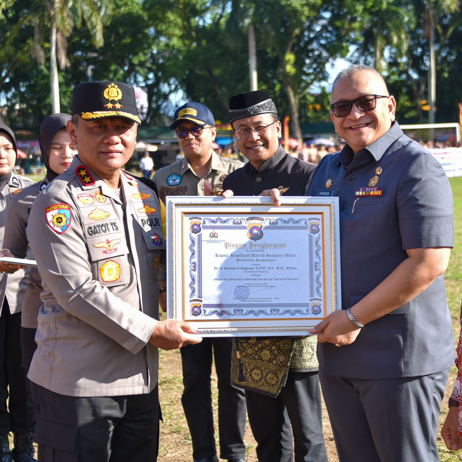 Dalam kesempatan ini, Polda Sumbar juga memberikan penghargaan kepada Pj Wali Kota Padang Andree Algamar sebagai Tokoh Pelopor Anti Tawuran dan Balapan Liar.