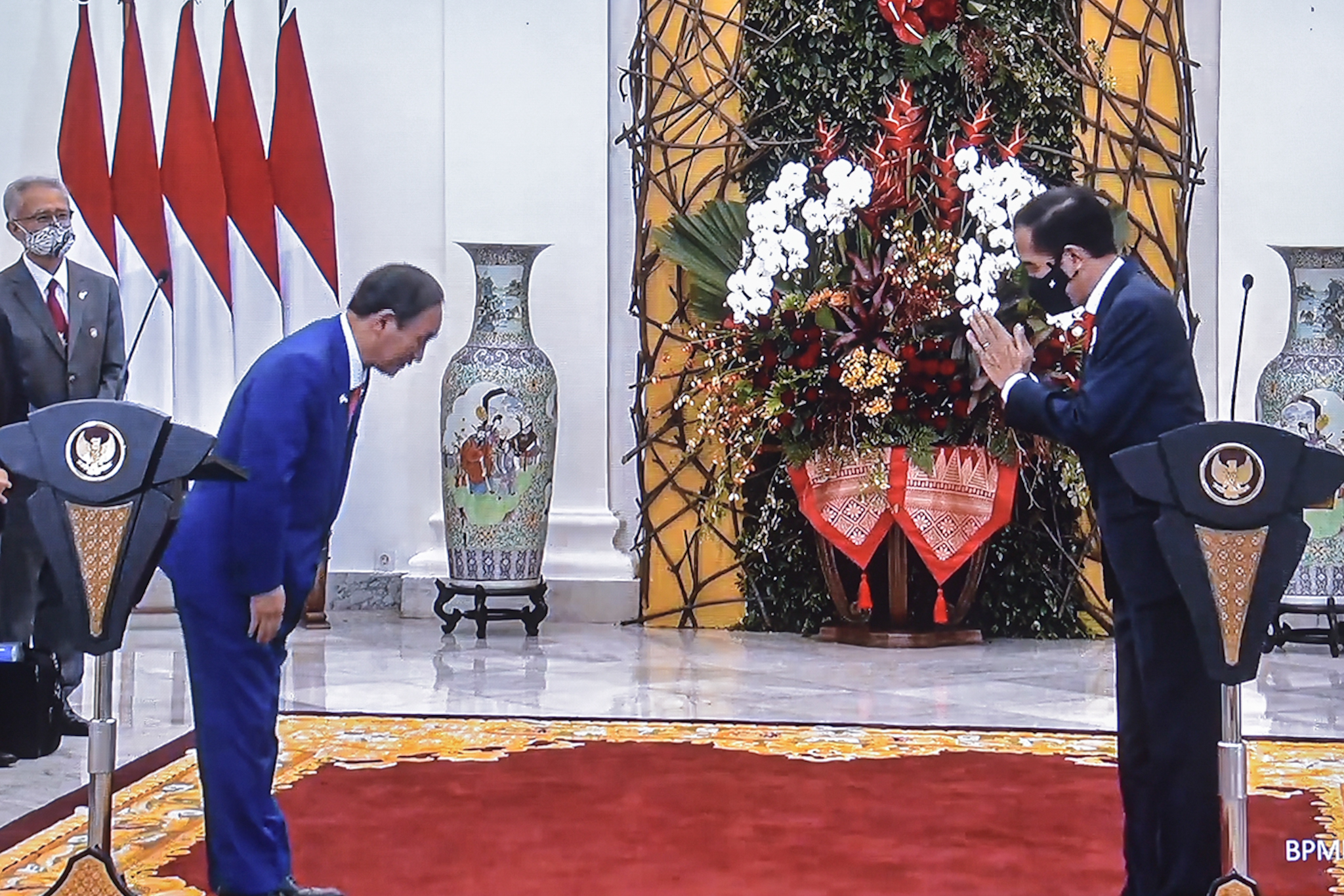 Presiden Jokowi, dalam pernyataan pers bersama PM Yoshihide Suga usai pertemuan, menyatakan bahwa kunjungan yang merupakan rangkaian kunjungan pertama PM Suga setelah dilantik sebagai Perdana Menteri bulan September yang lalu menunjukkan arti penting Indonesia dan kawasan Asia Tenggara bagi Jepang.
