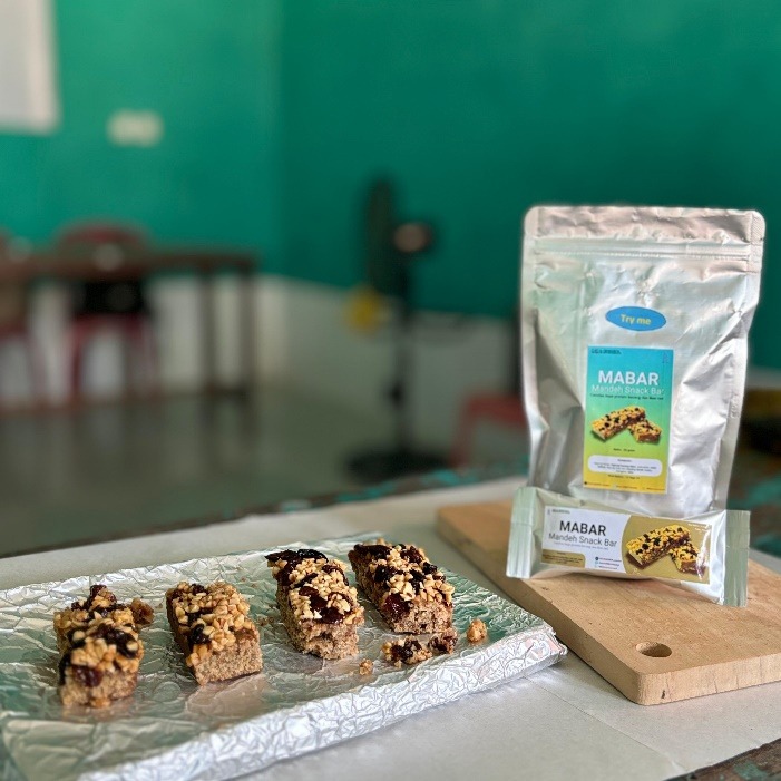 Sesi ketiga yang paling ditunggu-tunggu oleh peserta adalah praktik pembuatan produk snack bar berbasis ikan teri dan kacang-kacangan. Sesi ini dipandu oleh Rahmayani, mahasiswa S2 TPHP Unand, yang dengan antusias membimbing peserta langkah demi langkah dalam pembuatan snack bar. Rahmayani menjelaskan bahwa ikan teri dan kacang-kacangan dipilih sebagai bahan utama karena keduanya memiliki nilai gizi yang tinggi dan mudah didapatkan di Nagari Mandeh.