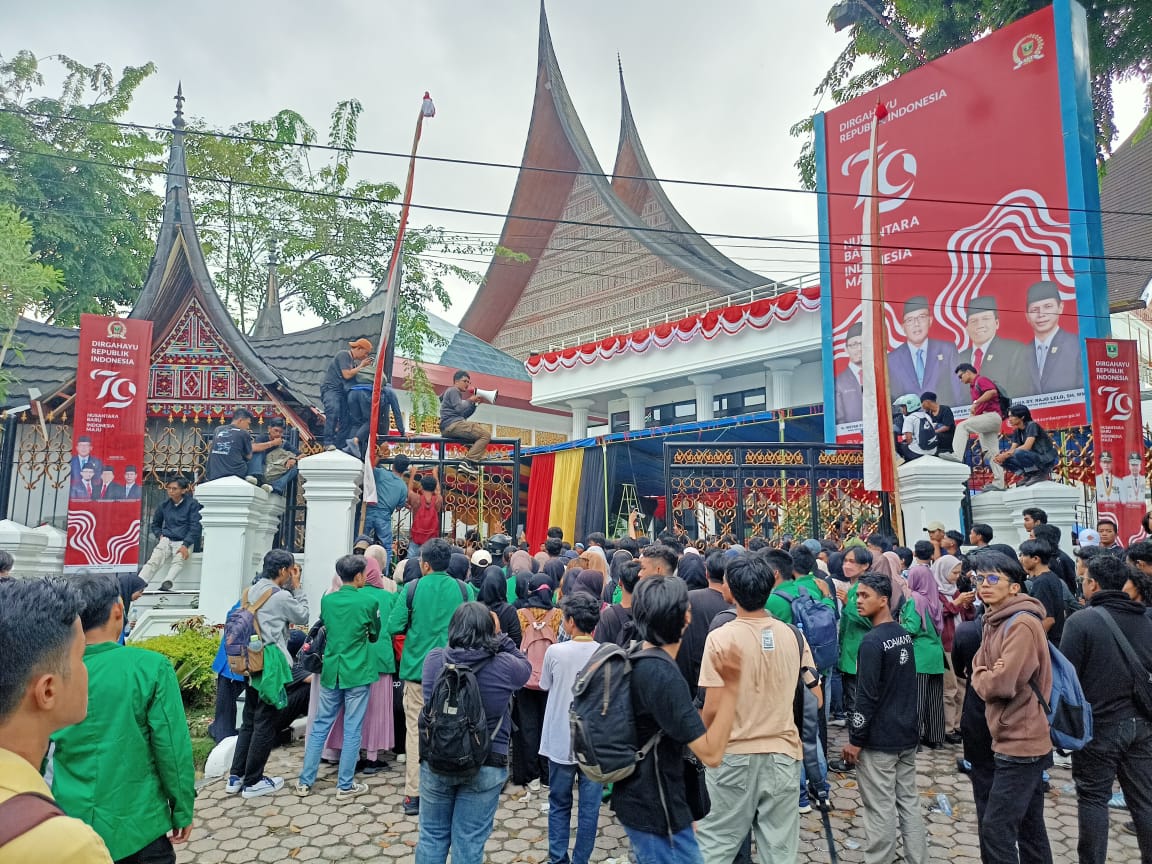 Langgam.id – Ratusan aktivis hingga mahasiswa yang melebur dalam aksi unjuk rasa untuk tetap menjaga demokrasi dan menolak politik dinasti Jokowi di depan Gedung DPRD Sumatra Barat, Kamis (22/8), memastikan akan melanjutkan aksi hingga tuntutan seperti pembatalan pembahasan RUU Pilkada dibatalkan DPR RI.