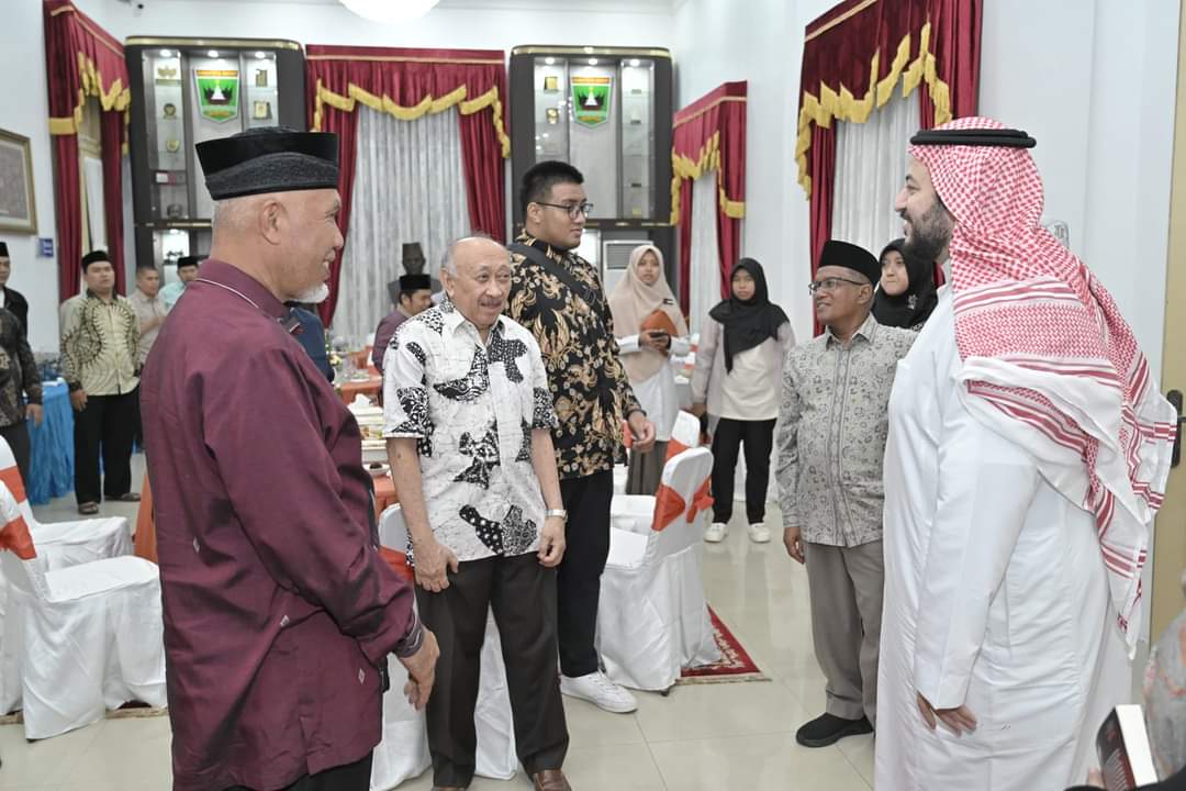 Gubernur Sumbar Mahyeldi Ansharullah, meyambut kedatangan Dr. Khalid Muhammad Al Bahjat Ahmad Khatib Al Minangkabawi di Istana Gubernur Sumbar, Minggu (22/10/2023) malam.