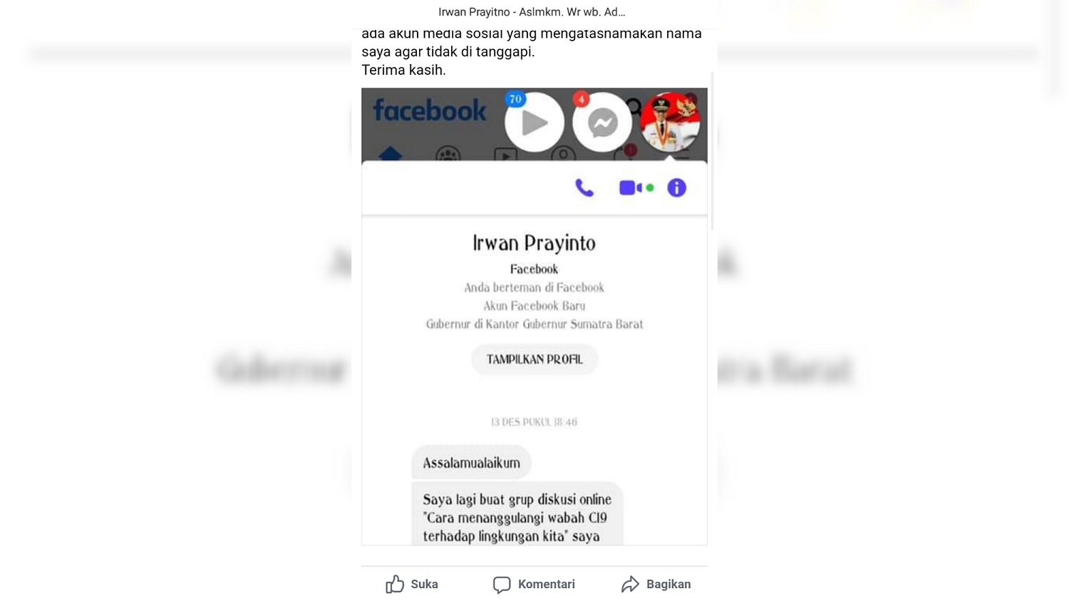 Hal ini disampaikan oleh Gubernur Sumbar Irwan Prayitno lewat akun facebooknya Irwan Prayitno Official. Ia membagikan sebuah screenshot yang berisi percakapan usaha penipuan tersebut, Sabtu (26/12/2020).