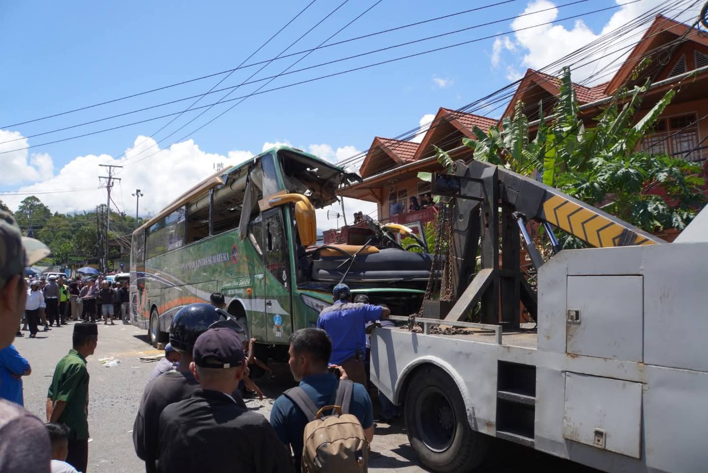 Kecelakaan tunggal bus bernopol B 7512 FGA jurusan Medan-Bekasi via Padang itu, terjadi Selasa pagi sekitar pukul 08.15 WIB di ruas Jalan Hamka, Kelurahan Bukit Surungan, Kecamatan Padang Panjang Barat. Bus terbalik setelah menghantam trotoar depan Puskesmas Busur yang diduga akibat rem blong.