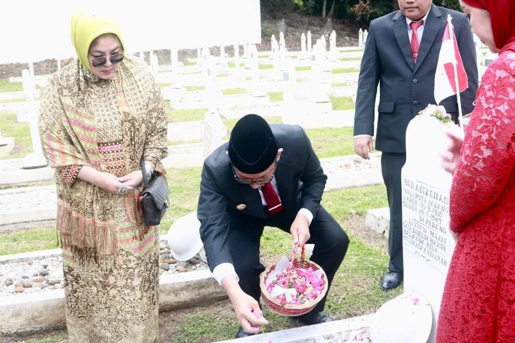 Kegiatan kunjungan ziarah makam dan tabur bunga terasa khidmat dan menyentuh hati saat Wali Kota Padang, Hendri Septa berserta jajaran pimpinan Organisasi Pimpinan Daerah (OPD) dan keluarga besar dari Bagindo Aziz Chan menaburkan bunga di atas makam Sang Pahlawan.