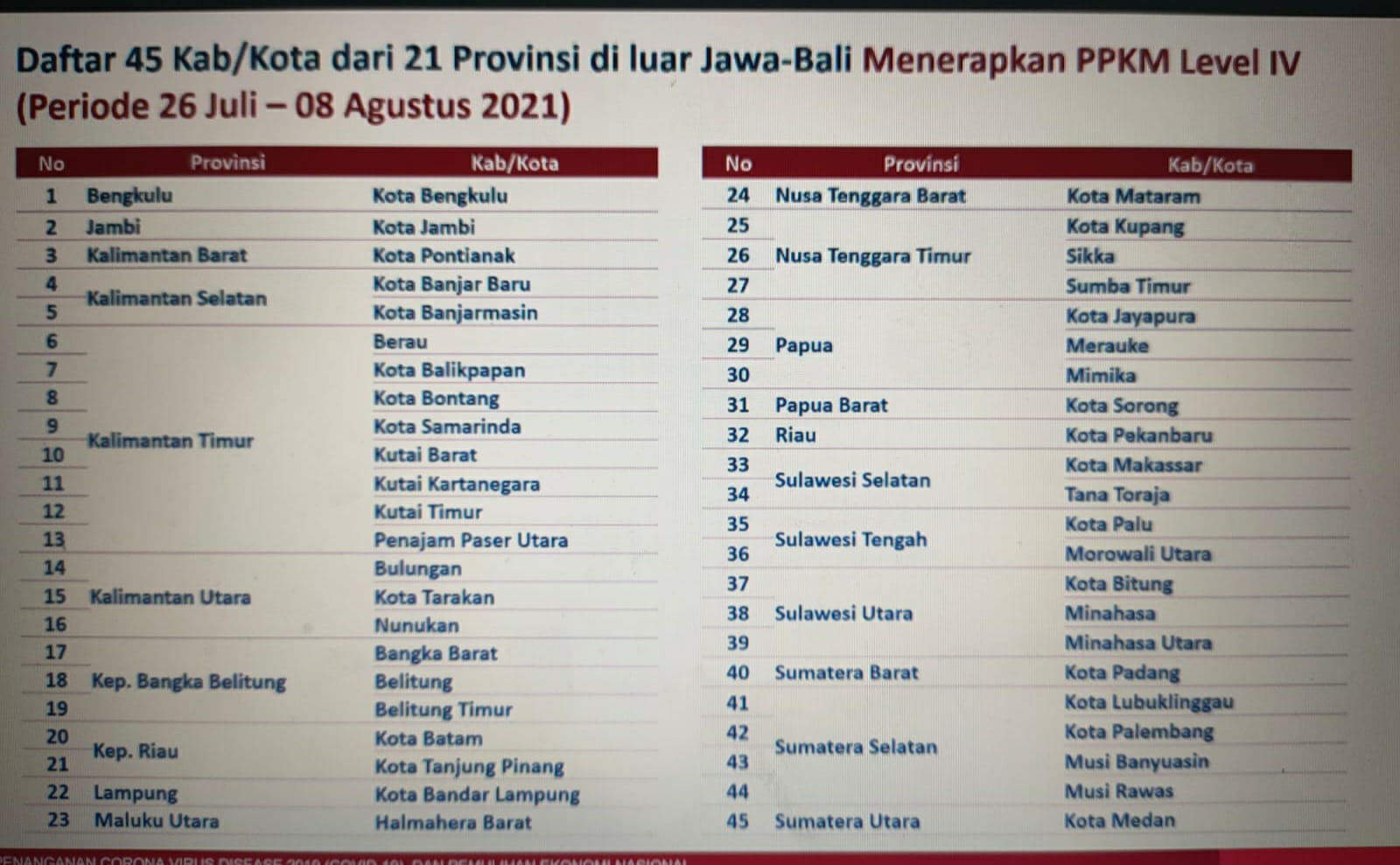 Sebanyak 45 kabupaten/kota di 21 provinsi di luar Jawa-Bali menerapkan PPKM Level IV mulai 26 Juli hingga 8 Agutus 2021 nanti. Di Sumbar, hanya Kota Padang saja yang menerapkan PPKM Level IV ini.