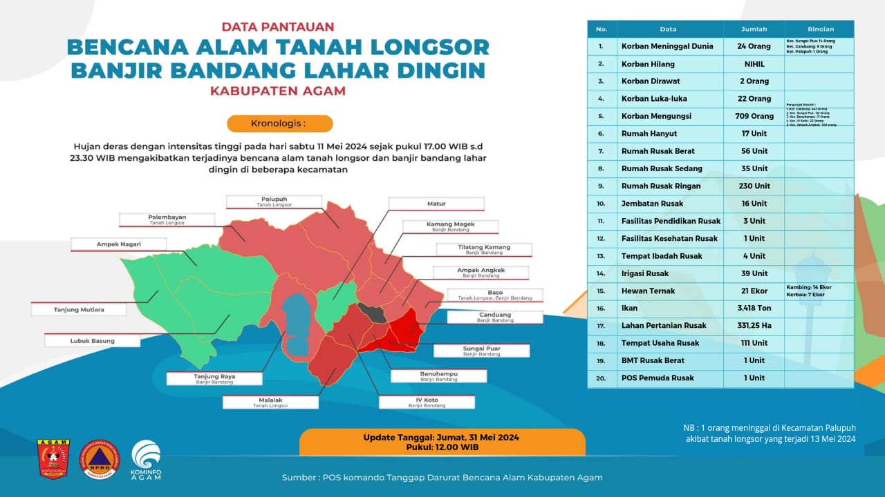 Hal tersebut dibenarkan Kepala Dinas Komunikasi dan Informasi (Kominfo) Kabupaten Agam Syatria, update data dari 31 Mei-2 Juni 2024 ini merupakan hasil survei lapangan dan pendataan yang dilakukan BPBD Agam di lapangan.