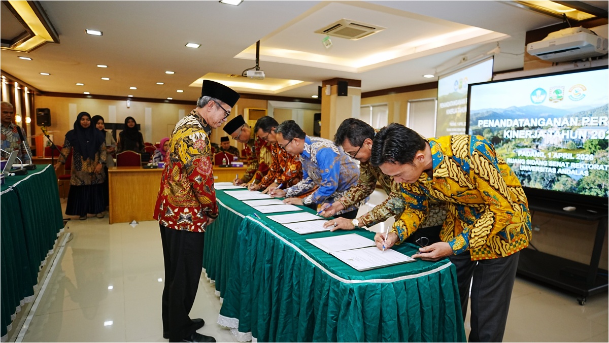 Langgam.id — Universitas Andalas (UNAND) memperkuat tata kelola berbasis akuntabilitas melalui penandatanganan Dokumen Perjanjian Kinerja Tahun 2026 oleh pimpinan fakultas dan unit kerja, Rabu (2/4/2026). Kegiatan berlangsung di Ruang Sidang Senat, Gedung Rektorat, Kampus Limau Manis.