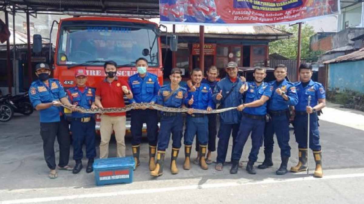 Langgam.id – Petugas dari tim animal rescue Pemadam Kebakaran mengevakuasi seekor ular piton sepanjang 3 meter dari taman di Kota Payakumbuh. Petugas kebersihan menemukan ular tersebut di tepian aliran sungai dekat taman.