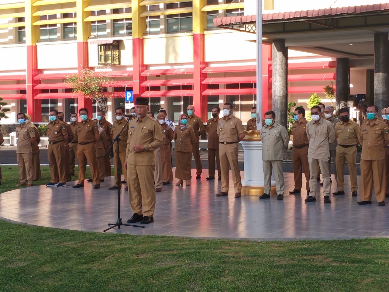 Langgam.id – Gubernur Sumatra Barat (Sumbar) Mahyeldi memimpin apel perdana bersama jajaran Pemerintah Provinsi (Pemprov) Sumbar di Lapangan Kantor Gubernur, Senin (1/3/2021).