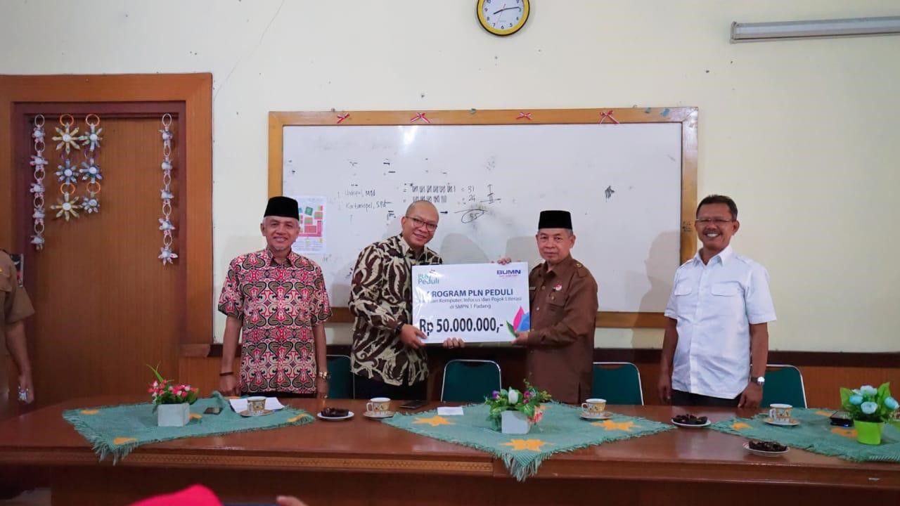 Bertempat di ruang rapat SMPN tersebut, Senior Manager SDM dan Umum PLN IUW Sumbar Kishartanto Purnomo Putro menyerahkan bantuan secara simbolis, pada Senin (15/7/2019).