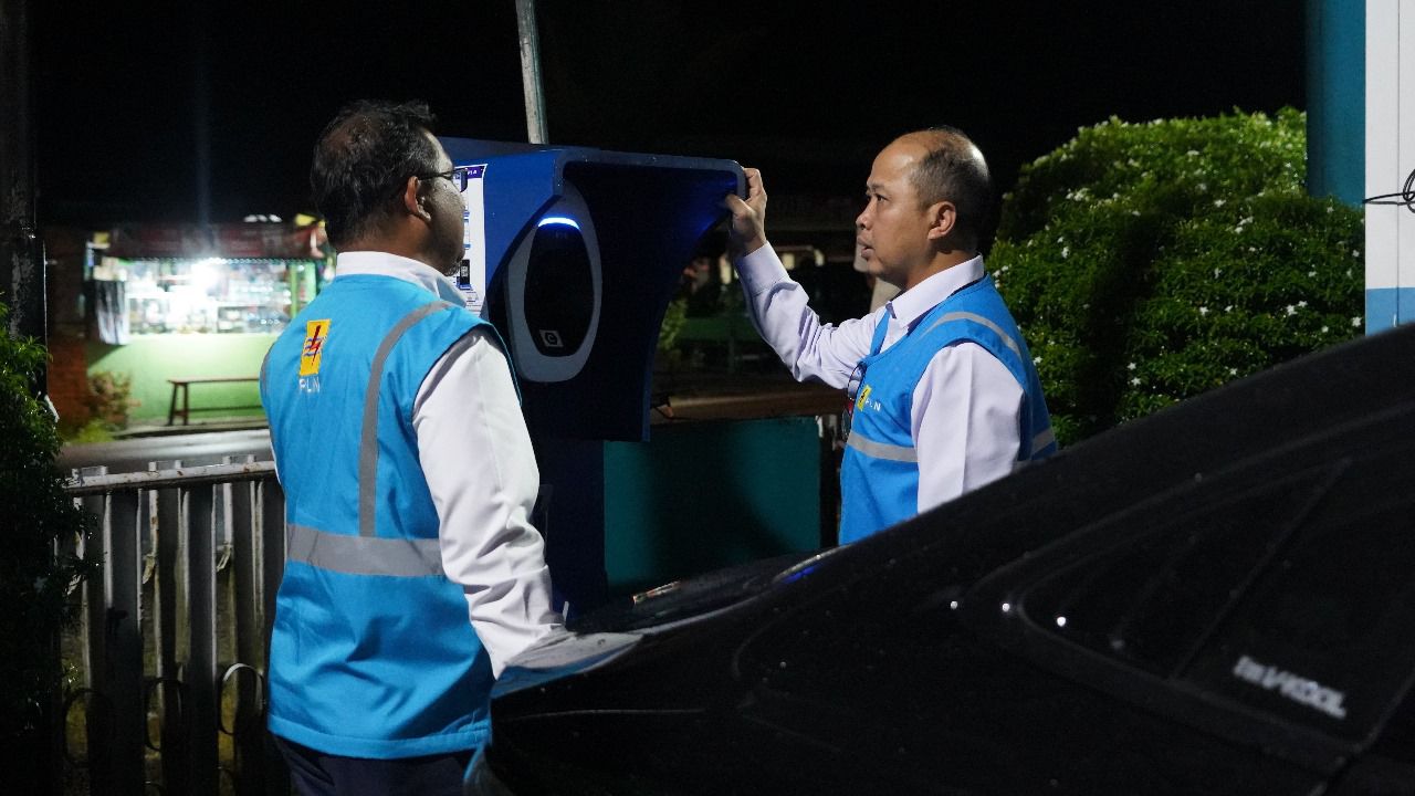 Ajrun dan rombongan memastikan langsung SPKLU milik PLN siap melayani pengguna kendaraan listrik selama musim mudik dan liburan.