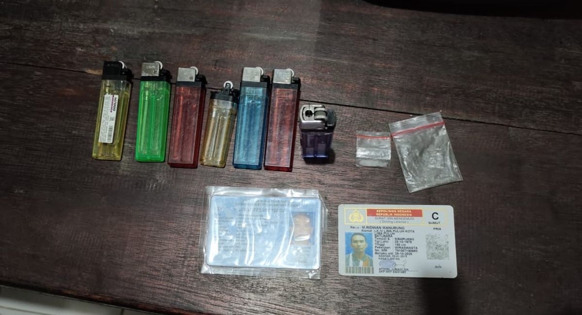Petugas menyita sejumlah barang bukti dari tangan pelaku. Barang disita berupa satu paket kecil narkoba bentuk sabu berbungkus plastik bening, satu buah mancis ungu yang sudah terpasang jarum sumbu di bagian ujungnya.