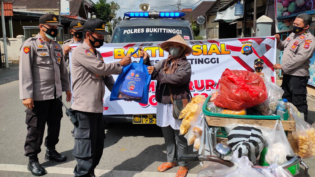 Kasat Binmas Polres Bukittinggi AKP Dwi Purwito mengatakan hari ini pihaknya menyerahkan bantuan sosial (bansos) kepada pedagang kaki lima, pedagang keliling atau menggunakan gerobak yang terdampak PPKM Darurat di Pasar Aur Kuning dan Pasar Bawah Kota Bukittinggi.